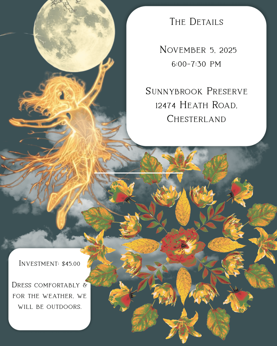 This gathering is all about reconnecting with your inner child (the playful, curious, creative part of you) through movement, nature, and ritual. We’ll walk, build a nature mandala, make a simple “potion” from natural treasures, and enjoy firelight, tea, and community.